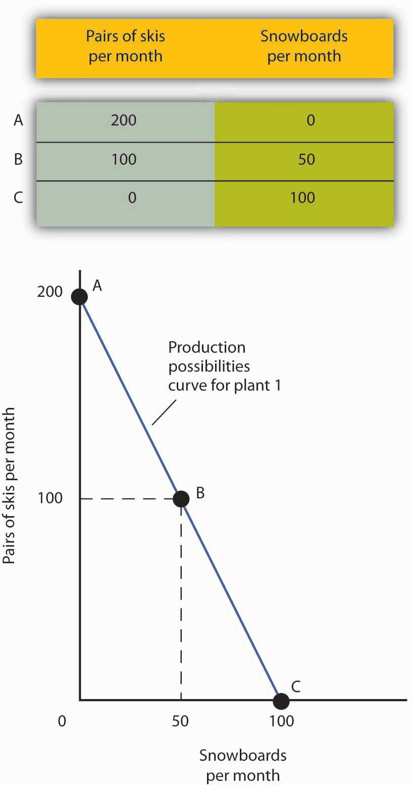 The table in [Figure 1 – Production Possibilities Curve] shows three combinations of skis and snowboards that Factory 1 can produce each month. Combination A implies that the factory devotes itself entirely to producing skis; Combination C means that all of the factory’s resources are devoted to producing snowboards; Combination B implies that both goods are produced. These values are plotted on the production possibilities curve for plant 1. The curve is a downward-sloping straight line, indicating that there is a negative linear relationship between the production of the two goods.