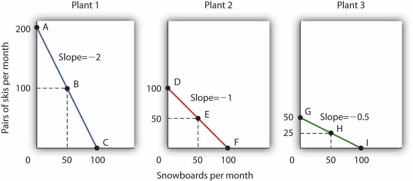 The figure gives the slopes of the production possibilities curves for each of the firm’s three plants. The opportunity cost of an additional snowboard at each plant is equal to the absolute values of these slopes. More generally, the absolute value of the slope of any production possibilities curve at any point gives the opportunity cost of an additional unit of the good on the horizontal axis, measured in terms of the number of units of the good on the vertical axis that must be forgone.