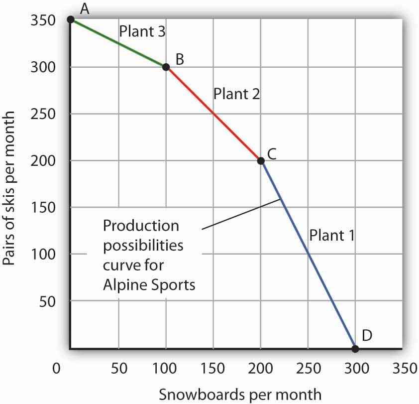 The combined production possibilities curve for Alpine Sports’ three plants is shown in [Figure 4 – The Combined Production Possibilities Curve for Alpine Sports]. We start at point A, with all three plants producing only skis. Total output is 350 pairs of skis per month and zero snowboards. If the firm were to produce 100 snowboards at Plant 3, ski output would drop by 50 pairs per month (recall that the opportunity cost per snowboard at Plant 3 is half a pair of skis). This would reduce ski output to 300 pairs, at point B. If Alpine Sports were to produce even more snowboards in a single month, it would shift production to Plant 2, the facility with the second lowest opportunity cost. Producing 100 snowboards at Plant 2 would leave Alpine Sports producing 200 snowboards and 200 pairs of skis per month, at point C. If the firm were to switch entirely to producing snowboards, Plant 1 would be the last to switch because the cost of each snowboard there is 2 pairs of skis. With all three plants producing only snowboards, the firm is at point D on the combined production possibilities curve, producing 300 snowboards per month and no skis.