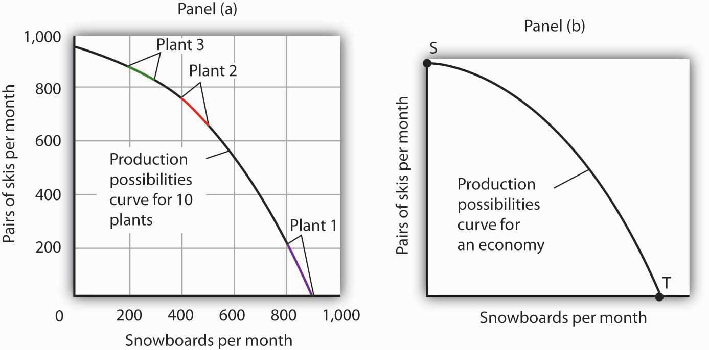 À mesure que nous combinons les courbes des possibilités de production pour de plus en plus d’unités, la courbe devient plus lisse. Il conserve sa pente négative et sa forme courbée. Dans le panneau (a), nous avons une courbe combinée des possibilités de production pour les sports alpins, en supposant qu’ils disposent désormais de 10 usines produisant des skis et des snowboards. Même si chacune des usines a une courbe linéaire, les combiner en fonction de leur avantage comparatif, comme nous l’avons fait avec 3 usines dans [Figure 4 – La courbe des possibilités de production combinées pour les sports alpins], produit ce qui semble être une courbe lisse et non linéaire, même s’il est constitué de segments linéaires. En traçant les courbes des possibilités de production pour l’économie, nous supposerons généralement qu’elles sont lisses et « courbées », comme dans le panneau (b). Cette courbe représente toute une économie qui produit uniquement des skis et des snowboards.