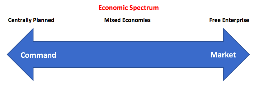 La plupart des économies dans le monde réel sont mixtes ; elles combinent des éléments des systèmes de commande et de marché (et même traditionnels). L’économie américaine est positionnée vers l’extrémité du spectre orientée vers le marché. De nombreux pays d’Europe et d’Amérique latine, bien qu’ils soient principalement orientés vers le marché, ont un degré d’implication du gouvernement dans les décisions économiques plus important que l’économie américaine. La Chine et la Russie, bien qu’elles soient plus proches d’un système orienté vers le marché aujourd’hui qu’il y a plusieurs décennies, restent plus proches de l’extrémité du spectre de l’économie planifiée. Une riche source d’informations sur les pays et leurs économies peut être trouvée sur le site web de la Heritage Foundation.