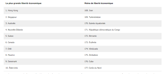 Le rapport Indice de liberté économique 2013 de la Heritage Foundation a classé 177 pays à travers le monde : quelques exemples des pays les plus libres et les moins libres sont répertoriés dans le tableau 1. Plusieurs pays n’ont pas été classés en raison d’une extrême instabilité qui rendait impossible tout jugement sur la liberté économique. Ces pays comprennent l’Afghanistan, l’Irak, la Syrie et la Somalie.
