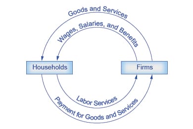 In economics, a good model to start with is the circular flow diagram shown below. It describes the economy as consisting of two groups – households and businesses – interacting in two markets: the goods and services market in which businesses sell and households buy, and the labor market in which households sell their labor to businesses or other employees.