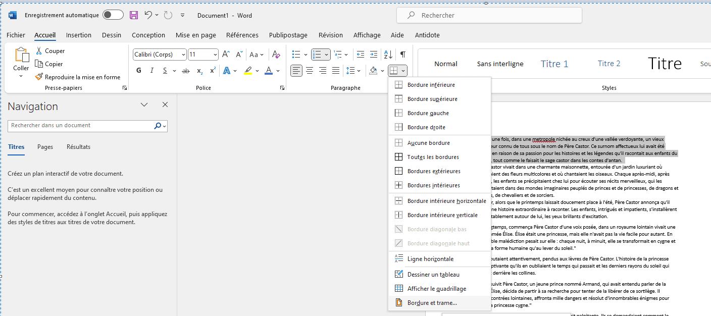 The “Box” option highlights text by surrounding it with a border. To frame text, select the text you wish to frame, then click on the “Home” button in the toolbar. In the “Paragraph” section of the toolbar, click on the « Border ” button and select the desired border option from the drop-down menu.