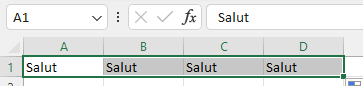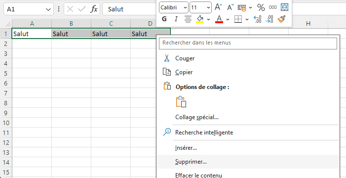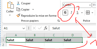 Exemple : J’ai modifié le mot « bonjour » par le mot « salut », puis j’ai fait glisser les données de la cellule vers la droite pour copier rapidement le mot.