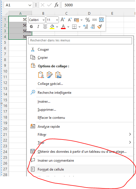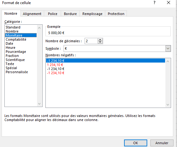 Exemple : Je décide de formater ma série de chiffre en date, je fais une clique droite et je sélectionne « format de cellule » puis je choisis le type de format numérique qui me convient. Je vais choisir le format monétaire en euro.