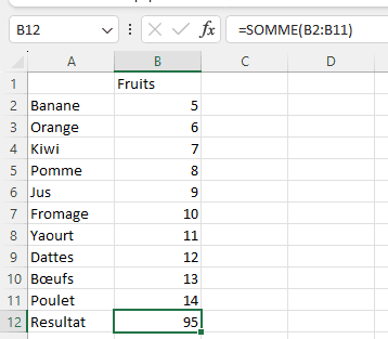 - Fonction SOMME : Cette fonction calcule la somme de plusieurs nombres. Par exemple :