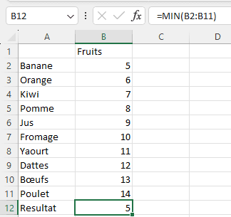 - Fonction MIN : Cette fonction renvoie la valeur minimale d’un ensemble de nombres. Exemple :
