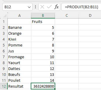 - Fonction PRODUIT : Cette fonction multiplie plusieurs nombres, par exemple :