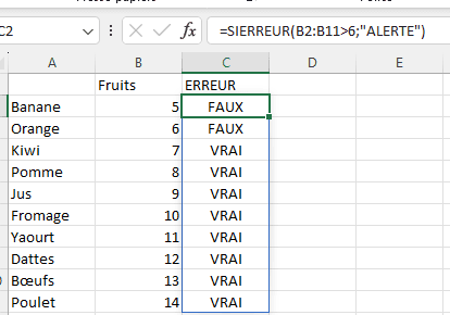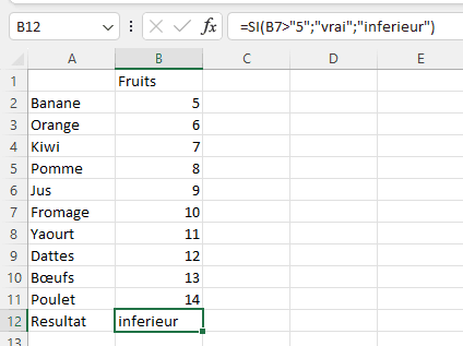 Exemple : J’ai inscrit pour ma cellule B7 que si le nombre est supérieur à 5, alors il faut mettre vrai, sinon il faut mettre « inferieur ».