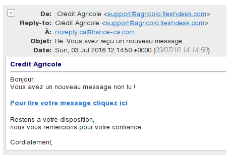 Vrai email : support@créditagricole.com (Imaginons que ce soit le vrai email)